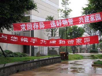 6月15日,卓锦城一期前期物业合同到期,原物业服务公司将退出苑区,勤信物业公司通过公开竞聘,经业主大会表决,多数业主通过,被选聘为新一届物业服务公司。得知勤信物业公司将于当天进驻卓锦城一期,苑区业主们奔走相告,自发组织起来,在苑区内悬挂横幅表示欢迎。