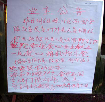 小区业主为表达感谢之情,5月7日、8日两天自发在小区发布公告为受伤队员进行募捐,捐款达2100余元。5月8日晚19:30左右,小区50多名业主代表自发到医院看望了受伤员工,并将捐款、锦旗和慰问品送到了两名秩序维护员手中,表达了业主们的感激之情,受伤员工和物业工作人员被业主们的善举深深感动,在表达谢意的同时,也表示在今后的工作中依然尽职尽责,为业主们创造一个和谐安宁的生活环境而努力。