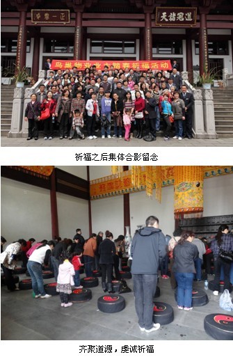 早上9点,大巴车分别从玲珑南域、双流锦镇出发,经过近两个小时的旅程,我们到达目的地——大邑县鹤鸣山道源圣城。11:00在祖天师殿进行的祈福仪式,掀起了整个活动的高潮,祈福过程中,业主们虔诚的跪在蒲团上,默默的为亲人、朋友的幸福安康祈祷;在接下来的午餐时间,物业服务工作人员和业主、业主和业主进行了愉快的沟通;午餐过后稍作休息,便由专业导游带领业主,介绍整个景区的的景点以及道教的文化;下午两点,导游介绍完毕后,在大殿的门口,一些老年业主在道源圣城太极拳大师的带领下,打起了太极;很多业主还兴致勃勃的去道源圣城的老君殿登山……