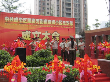 2011年7月1日建党90华诞之日,锦绣东方社区举行了隆重的系列庆祝活动。上午10时,“中共成华区跳蹬河街道锦绣小区总支部成立大会”揭牌仪式正式开始,成华区区委组织部周部长致辞,并与街道党工委副书记李冬辉一起为党总支成立揭牌。跳蹬河街道办党委书记李云、主任罗远江及相关领导宋宝利、李冬辉、王先峰,锦绣东方社区主任陈利金、副书记宋森等到会,社区近300个党员及众多业主一同参与了揭牌仪式。