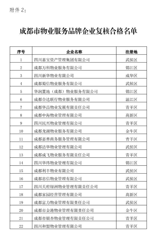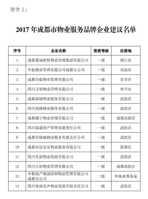 根据《成都市物业管理行业品牌建设工作指导意见》(成物协〔2015〕11号)和成都市物业管理行业品牌建设委员会《关于开展2017年成都市物业服务品牌企业评定工作的通知》(成物品牌委〔2017〕1号)相关规定,经评定及复核,成都嘉诚新悦物业管理集团有限公司14家物业服务企业评定合格进入品牌企业建议名单,四川嘉宝资产管理集团有限公司等40家品牌企业复核合格。现予以公示,公示时间为20171229日至2018年1月5日。如有异议,请于公示期内以实名书面形式反馈至品牌建设委员会秘书处。