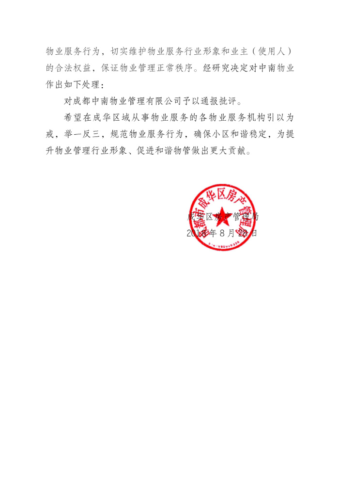 上一条:关于召开2018年度成都市物业管理行业信息联络员大会暨品牌形象提升培训会的通知 下一条:关于对成都港联物业管理有限公司的通报