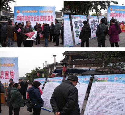 为促使广大市民提高对物业法律法规知识的认识和运用水平,提升物业管理理念和有偿服务意识,规范物业服务企业经营行为,营造全社会关心、理解、支持物业管理的良好氛围。12月4日,邛崃市房产管理局会同邛崃市物业管理协会在邛崃市临邛镇步行街小广场举办了“12.4法制宣传暨邛崃市物管行业法规知识宣传活动”。