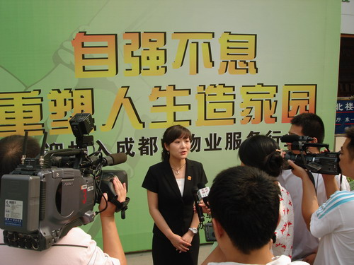 据了解,“5·12”特大地震后,成都市物业管理协会积极发动会员单位向灾区人民献爱心,捐款捐物达千万余元。灾后重建启动后,该协会积极提供就业平台,帮扶灾区群众实现新的就业,以增加收入。6月初,该协会组织会员单位在都江堰滨河小区举办了一场面向灾区群众的招聘会,130名受灾群众在物业服务企业找到理想的工作。“通过这次培训,我对工作更有信心了,对明天的生活更充满希望了!”都江堰市区的汤泽波家被震成了废墟,苦心经营的电器维修铺子也化为乌有,在物业专场招聘会上,他应聘到华昌物业公司做设备维护员。