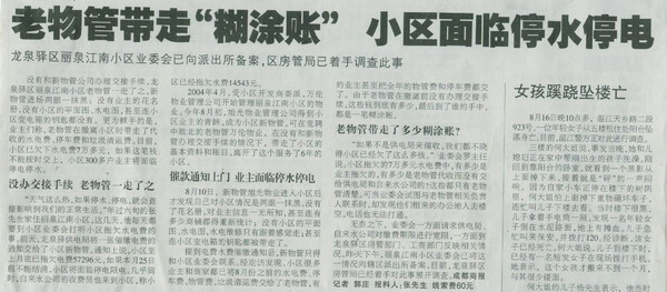 近日,某媒体以《老物管带走“糊涂账”,小区面临停水停电》为题,报到了龙泉驿区丽泉江南小区新老物管不按规定进行交接,给小区业主造成诸多不便一事。且不论事情起因如何,两家冠以“专业化”头衔的物业服务企业,却作出如此莽撞、无知之行为,置法规政策于不顾,置广大业主合法权益于不顾,置行业苦心经营维护的市场环境和秩序于不顾,置行业同仁多年来精心塑造的行业形象于不顾,着实让业内人士所不齿。笔者在此就媒体所陈述的事情进行分析,以资行业参考和警示。